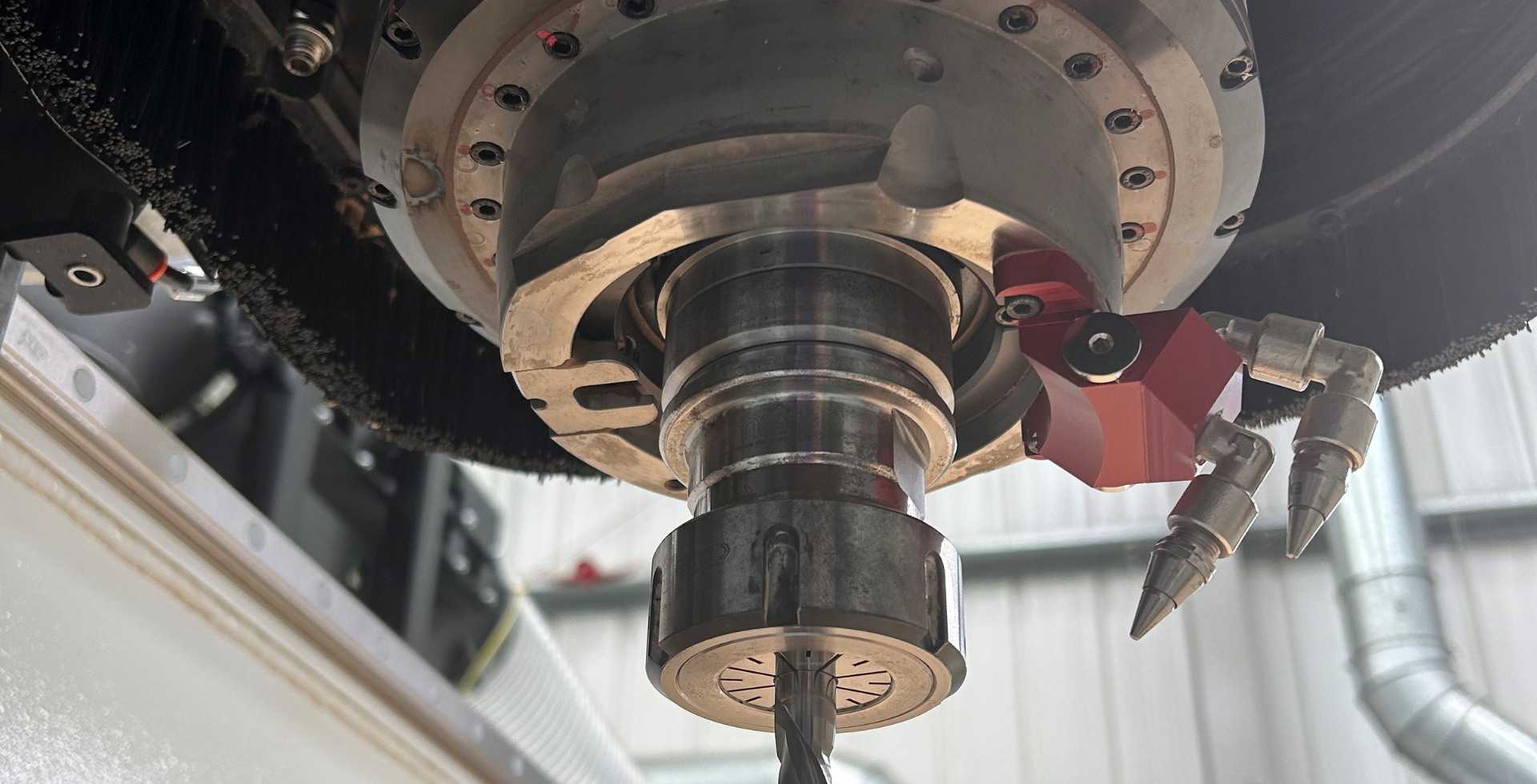 A set of high pressured nozzles are mounted to the rotating C axis and, using the compressed air veins that an aggregate would use, follows the cut line, dislodging any dust that has settled in the cutting channel. As soon as it becomes airborne, the dust is removed by the extraction system that sits over the spindle so that channels are clean and free from dust and the side surfaces of the pieces are totally clean.