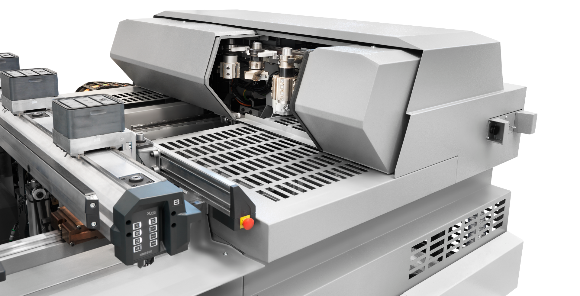 The Rover A Plus uses the same pod and rail systems as the Rover A and there’s a choice of ATS (Advanced Table-Setting System) with fast manual positioning of the clamping systems; SA (Set-Up Assistance) that includes linear sensors in the worktable and an anti-collision function; EPS (Electronic Positioning System) for automatic positioning; FPS (Feedback Positioning System) with self-learning of manually selected positions of vacuum modules and clamps; and XPS (Extreme Positioning System), which has a motor on every worktable and every carriage that enables simultaneous automatic positioning of all the locking systems in 16 fully independent locking areas. “It’s possible to work two separate sections of the machine simultaneously,” says Michael.